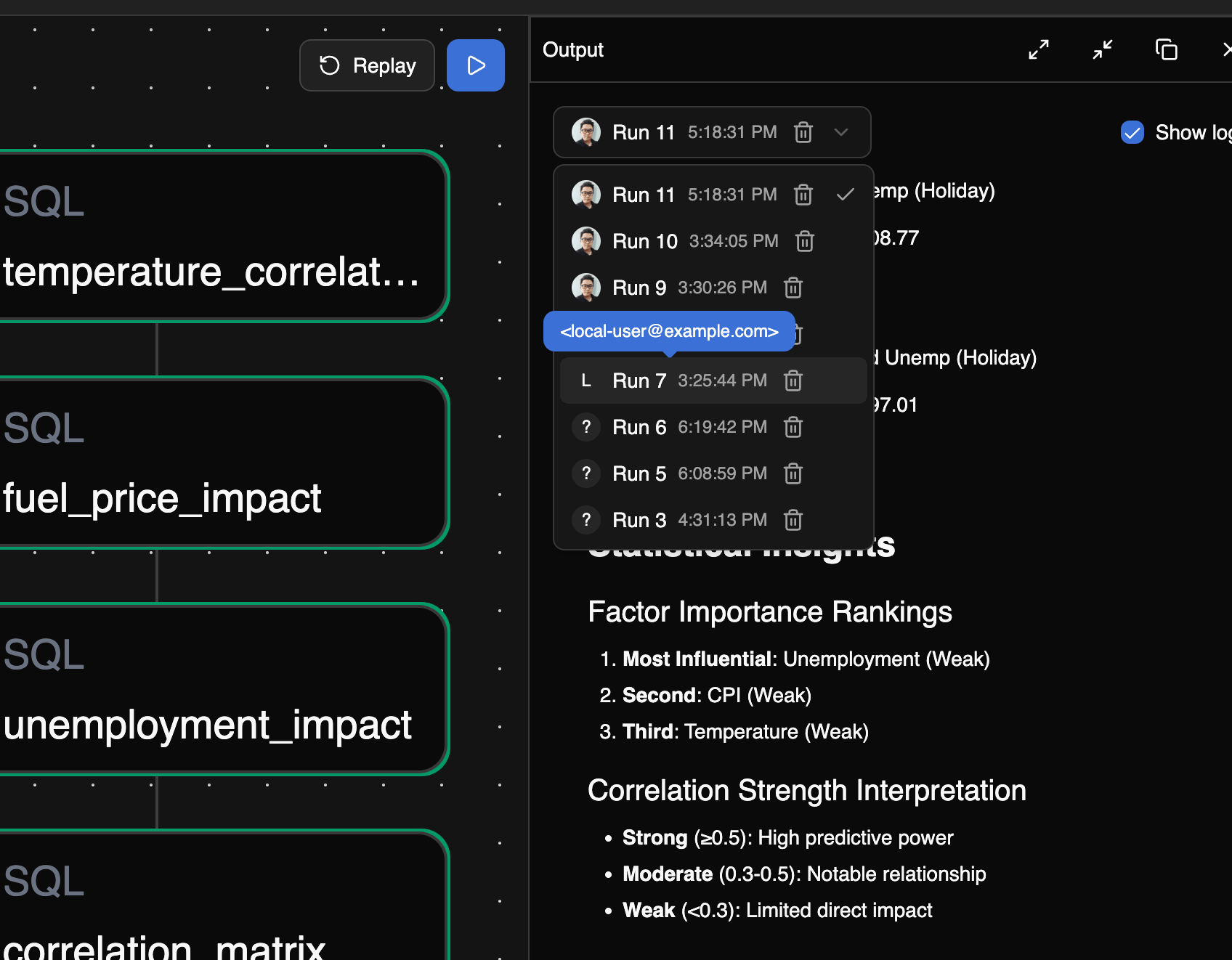 - Visual Attribution - UI displays user avatars and names for each run in the run selection dropdown